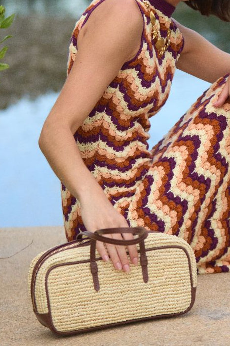 The Bowler Bag is a spacious woven raffia bowler with leather trim and a structured silhouette. Finished with interior lining and handles designed for comfort, it carries daily essentials with elevated style. Handcrafted by skilled artisans.